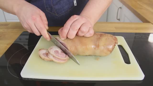 Нет ничего вкуснее колбас приготовленных на домашней кухне своими руками. Тем более, что процесс приготовления прост, а ингредиенты всегда доступны. Для приготовления домашней ветчины понадобиться: Рулька на кости – 1,5 кг Чеснок сушеный – 1 ч.л. Перец молотый – ½ ч.л. Соль – 1 ч.л. Для начала нужно разделать рульку отделив кожу, мясо и кости. Мясо нарежьте мелким кубиком, добавьте специи и хорошо перемешайте. Выложите мясо на кожу, сверните в рулет и плотно замотайте в пищевую пленку и оставьте на ночь, мариноваться. Рулет поместите в горячую воду и варите при температуре 80-90 около 4 часов. Важно не давать воде кипеть. Хорошо охладите ветчину и подавайте к столу. #Ветчина #Домашняяколбаса #Рулька #Домяшняяветчина #Копченаяколбаса #Мужикиуплиты