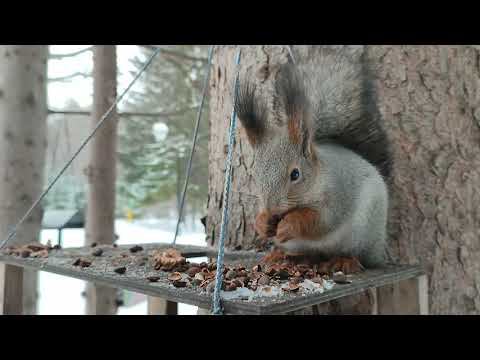 Четыре белки разобрались с кормушками