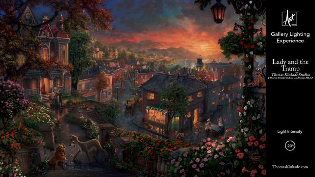 Learn more about Lady and the Tramp at https://thomaskinkade.com/art/disney-dumbo/ This is a simple demonstration of the Thomas Kinkade light dimming effect that can be seen in person at any local Thomas Kinkade Gallery. The effect, which is a trademark of almost all Thomas Kinkade paintings occurs when you slowly bring down the light illuminating the painting. The effect really feels as if the sun is setting inside of the painting, it's amazing! The sky begins to illuminate, sun patches on the ground really stand out and the windows of cottages seem glow brilliantly as if somebody’s at home. Is it an optical illusion or magic? Visit your local Thomas Kinkade Gallery and let us know what you think. About the Image: All of the unforgettable characters and moments in the film are captured for the enjoyment of the Thomas Kinkade collector. Who can forget the moment when they cemented their love for one another? The lights glow as the sun sets on this beautiful Victorian city. The flowered foreground and the explosions of color in the foliage are homage to the romantic realism of the film. The nuanced panorama as a whole will engage the viewer again and again as hidden details are newly found. Thomas Kinkade Studios’ Lady and the Tramp, an epic narrative of the classic Walt Disney film, will delight fans of all ages. Gallery Locator https://thomaskinkade.com/customer-service/galleries/