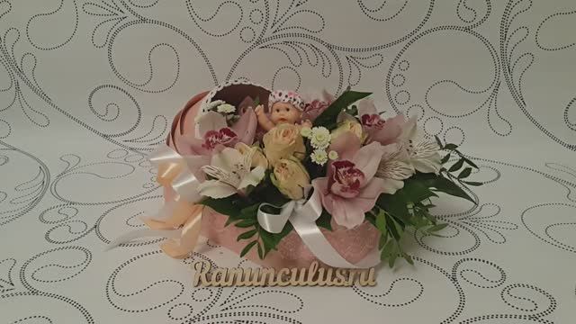Цветы в коробке люльке на выписку из роддома девочки. Оригинальный букеты на выписку из роддома : https://ranunculus.ru/podarki-na-rozhdenie-rebenka/bukety-na-vypisku-iz-roddoma/