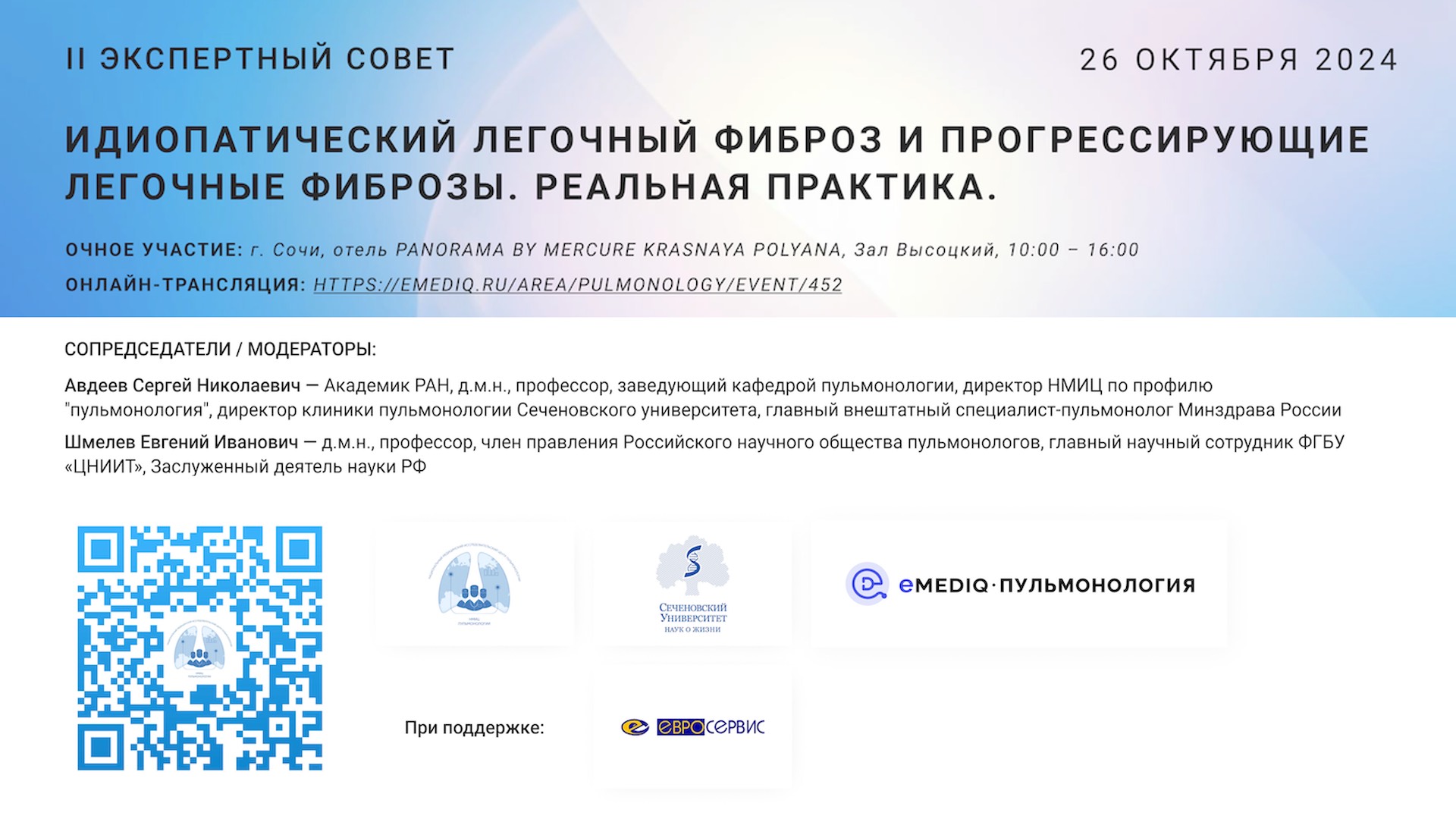 II ЭКСПЕРТНЫЙ СОВЕТ. Идиопатический легочный фиброз и прогрессирующие легочные фиброзы. Реальная практика. Сопредседатели / модераторы: АВДЕЕВ Сергей Николаевич — Академик РАН, д.м.н., профессор, заведующий кафедрой пульмонологии, директор НМИЦ по профилю "пульмонология", директор клиники пульмонологии Сеченовского университета, главный внештатный специалист-пульмонолог Минздрава России ШМЕЛЕВ Евгений Иванович — д.м.н., профессор, член правления Российского научного общества пульмонологов, главный научный сотрудник ФГБУ «ЦНИИТ», Заслуженный деятель науки РФ 10.00 — 10.30 ИЛФ и прогрессирующие легочные фиброзы: новости АTS, ERS 2024 (С.Н.Авдеев) 10.30 — 11.00 Лучевые методы в диагностике фиброзирующих заболеваний легких (О.В.Лукина) 11.00 — 11.30 ИЛФ и прогрессирующие легочные фиброзы: современные рекомендации (С.Ю.Чикина) 11.30 — 12.10 Новый регистр больных с ИЛФ в РФ (Н.В.Трушенко) 12.10 — 12.30 Перерыв 12.30 — 14.00 Клинические случаи (Л.В.Шульженко, И.В.Демко, И.В.Лещенко) 14.00 — 15:00 Перерыв 15:00 — 17.30 Клинические случаи (М.Ф.Киняйкин, Г.Л.Игнатова, В.В.Цома, З.М.Мержоева, Л.М.Куделя) 17.30 — Закрытие Конференции, "Протокол: подведение итогов"