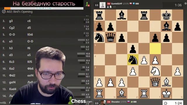 Донат на хорошее настроение https://donatepay.ru/don/Shuvalov Турнир https://www.chess.com/live#t=1978980?ref_id=26382922 Играю в сильнейшем онлайн-турнире с титулованными шахматистами. По окончании турнира - игра со спонсорами! Оформить спонсорскую подписку здесь https://bit.ly/2Axzp9V, после чего просто напишите в чате свой логин на игровой платформе и отправляйте вызов на партию. Вызовы принимаются на логин https://www.chess.com/member/shuvalov?ref_id=26382922 Анонсы стримов будут здесь https://www.facebook.com/ShuvalovChessSchool - подпишись, чтобы не пропустить. Какой программой я пользуюсь для анализа? - ChessBase! Последнюю версию можно найти тут https://www.chessbase.ru/?check=8 Вступай в мой клуб Пожиратели шахмат на чесс ком https://www.chess.com/club/pozhirateli-shakhmat?ref_id=26382922