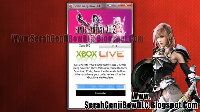 Today with this full video tutorial will show you how to get Final Fantasy XIII-2 Serah Genji Bow DLC for free on xbox 360 game and PS3 game. This is rare exclusive downloadable Final Fantasy XIII-2 Serah Genji Bow DLC to get it for free on your hand. Visit following web site and get more information about this; http://www.serahgenjibowdlc.blogspot.com/ When you got your Final Fantasy XIII-2 Serah Genji Bow DLC code, visit your game Marketplace (For Xbox Use Visit Xbox Live - For PS3 Users Visit PSN) and redeem the code. After that you will able to download Serah Genji Bow DLC for free on Final Fantasy XIII-2 Game.. Any more questions, you can send us a comment about it via our web site. Thank you and enjoy the game. Final Fantasy XIII-2 is the direct sequel to Final Fantasy XIII, a part of the Fabula Nova Crystallis: Final Fantasy series. It was developed by Square Enix and tri-Ace. The game takes place three years after the events of Final Fantasy XIII, and depicts the story of Serah Farron's journey across time and space to prevent the end of the world while searching for her missing sister, Lightning.