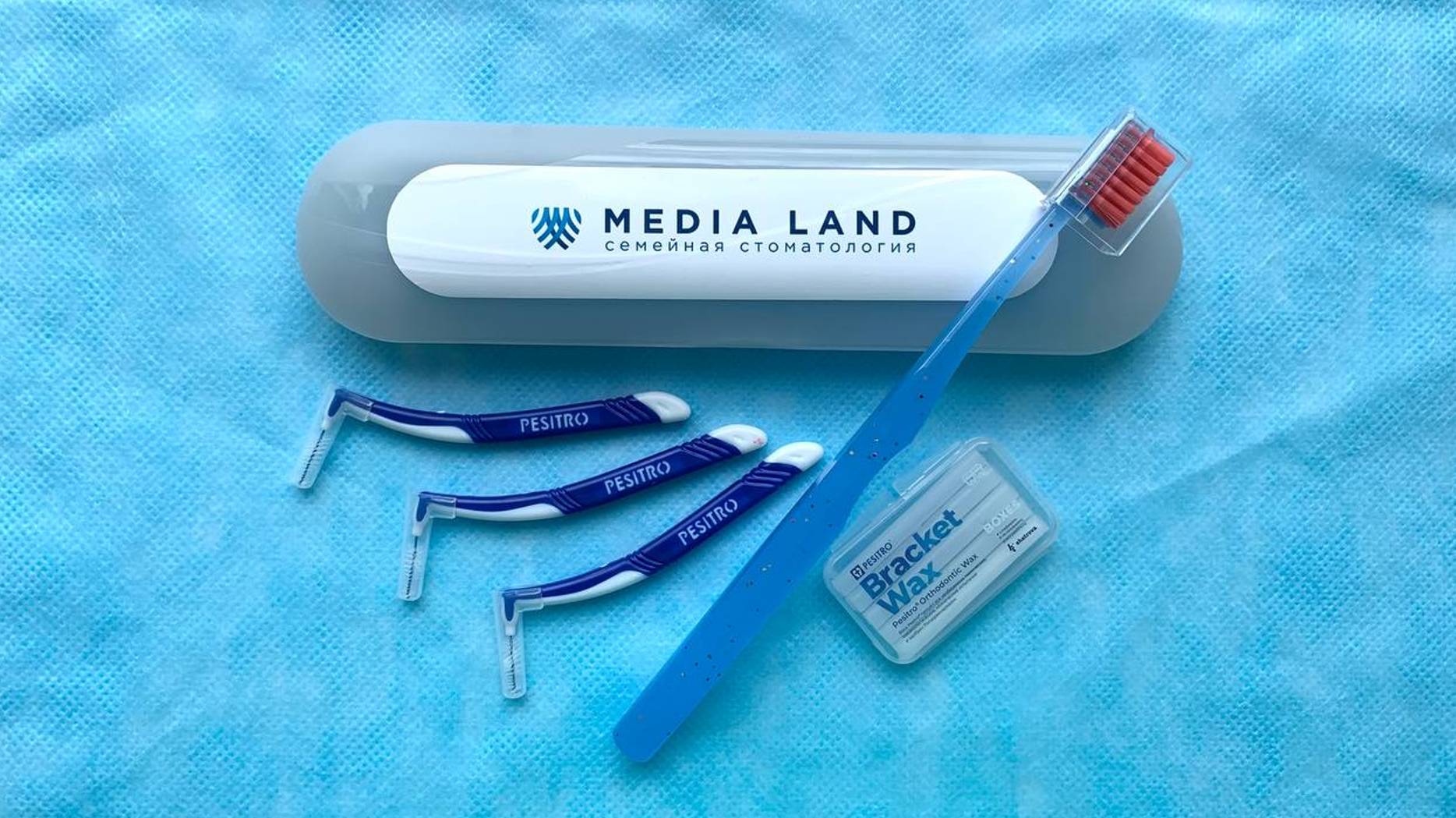 При установке брекетов в стоматологической клинике "МедиаЛэнд" каждому пациенту мы дарим специальный набор для ухода за зубами и брекетами!