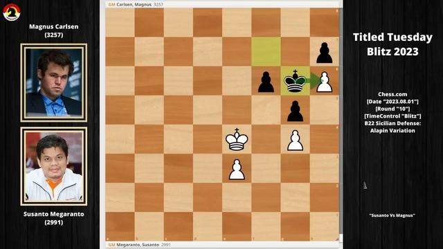 PGN Game ! Susanto Megaranto Vs Magnus Carlsen 2023 [Event "Titled Tuesday Blitz August 1 Early 2023"] [Site "Chess.com"] [Date "2023.08.01"] [Round "10"] [White "Megaranto, Susanto"] [Black "Carlsen, Magnus"] [WhiteElo "2991"] [BlackElo "3257"] [TimeControl "180+1"] 1. e4 c5 2. c3 d5 3. exd5 Nf6 4. d4 Nxd5 5. Nf3 cxd4 6. cxd4 Nc6 7. Nc3 a6 8. Bc4 Be6 9. Bb3 Nxc3 10. bxc3 Bxb3 11. axb3 e6 12. O-O Be7 13. Bf4 O-O 14. Ne5 Rc8 15. Qf3 Nxe5 16. Bxe5 Qd5 17. Qxd5 exd5 18. Rfc1 Rc6 19. c4 f6 20. Bf4 Bb4 21. cxd5 Rxc1+ 22. Rxc1 Rd8 23. Rc7 Rxd5 24. Rxb7 Rxd4 25. g3 a5 26. Rb5 Kf7 27. Bc7 Rd1+ 28. Kg2 Ra1 29. Bb6 Ra3 30. g4 Ke6 31. Bd8 Kd7 32. Rb8 Kc6 33. h4 Kd7 34. h5 Bc3 35. Ra8 g6 36. h6 Rxb3 37. Bxa5 Ra3 38. Ra7+ Ke6 39. Bb6 Rxa7 40. Bxa7 Bd2 41. Bd4 Bxh6 42. f3 Bf4 43. Bc5 Kd5 44. Be7 Be5 45. Bd8 Kc4 46. Be7 Kd3 47. Bd8 Ke2 48. Be7 f5 49. gxf5 gxf5 50. Bg5 h5 51. Bh4 Bd4 52. Bg5 Bf2 53. Bf4 h4 54. Be5 h3+ 55. Kxh3 Kxf3 56. Kh2 Be3 57. Kh1 Bf4 58. Bc3 Ke2 59. Bf6 Bd6 60. Bg5 Bc5 61. Kg2 Be3 62. Bh4 f4 63. Bg3 f3+ 64. Kh3 Bd2 65. Kg4 Be1 66. Bxe1 Ke3 67. Bg3 Ke2 68. Bh4 Ke3 69. Bg3 Ke4 70. Bf2 Kd3 71. Kg3 Kd2 72. Kxf3 Rekomendasi Produk (Catur, Ngonten, Workout, Fashion, Grooming): https://mycollection.shop/koleksishopeetony (Koleksi Afiliate Shopee) ______________________________________________ Semoga menjadi motivasi dan inspirasi bagi kita di dalam bermain catur selanjutnya. Diakhir Permainan/Video kita memberikan sesi puzzle dan Selamat Menjawab di kolom komentar ! Mari support terus Percaturan Indonesia yang lebih jaya Salam Catur Talk Indonesia Keep Sharing and Keep Loving. Sampai jumpa di video berikutnya. Bye bye :) Jika Anda memiliki pertanyaan, jangan ragu untuk mempostingnya di kolom komentar. Saya akan dengan senang hati menjawab & membantu Anda. Jika Anda menyukai video seperti ini, jangan lupa Like, Komentar & Share ya. Agar saya semakin bersemangat untuk berkarya selanjutnya. Jika Anda ingin mempelajari beberapa Taktik, tips & trik catur keren dan menjadi pemain catur yang lebih baik, maka Subcribe ke Channel "Catur Talk Indonesia" Sekarang juga. ______________________________________________ Support : https://lynk.id/caturtalk.id/ Subscribe: http://bit.ly/SubscribedisiniBro MEDIA SOCIAL & WEB Instagram: https://instagram.com/caturtalk.id Facebook : https://facebook.com/caturtalk.id Tiktok : https://www.tiktok.com/@caturtalk.id ______________________________________________ #caturtalk #susanto #magnus ............................................................................................. ** Affiliate disclaimer: some of the above links maybe affiliate links, which may generate me a sales commission.