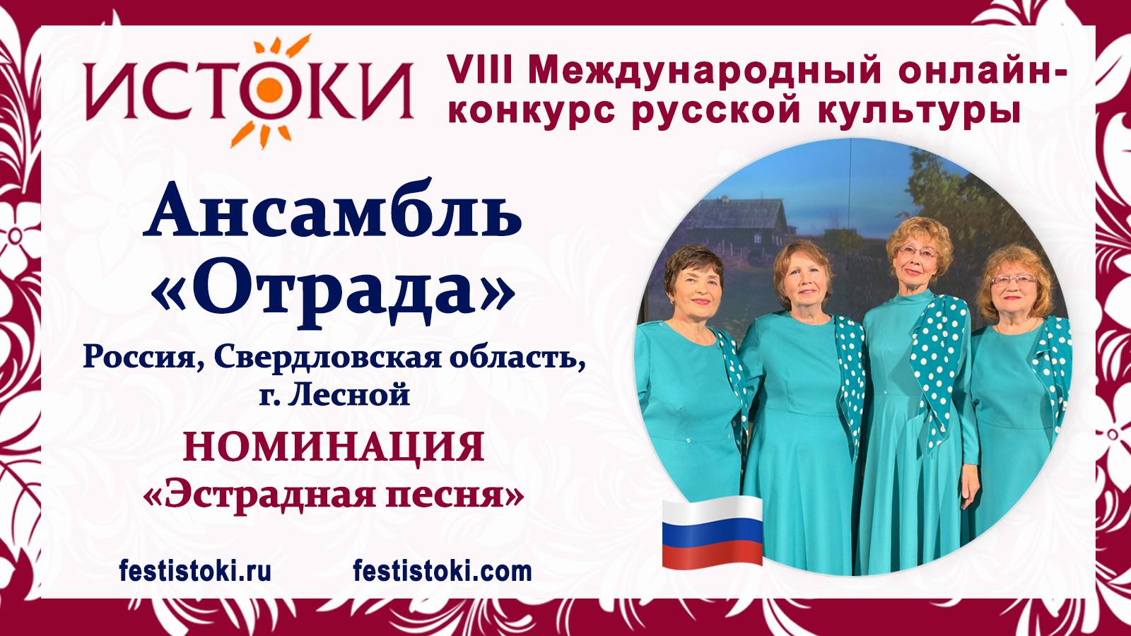 Участник VIII Международного онлайн-конкурса русской культуры "Истоки". Номинация "Эстрадная песня". Песня "Мамин старенький дом" Музыка Н. Семенов, слова В. Харько. Сайт: festistoki.ru / festistoki.com E-mail: festistoki@mail.ru