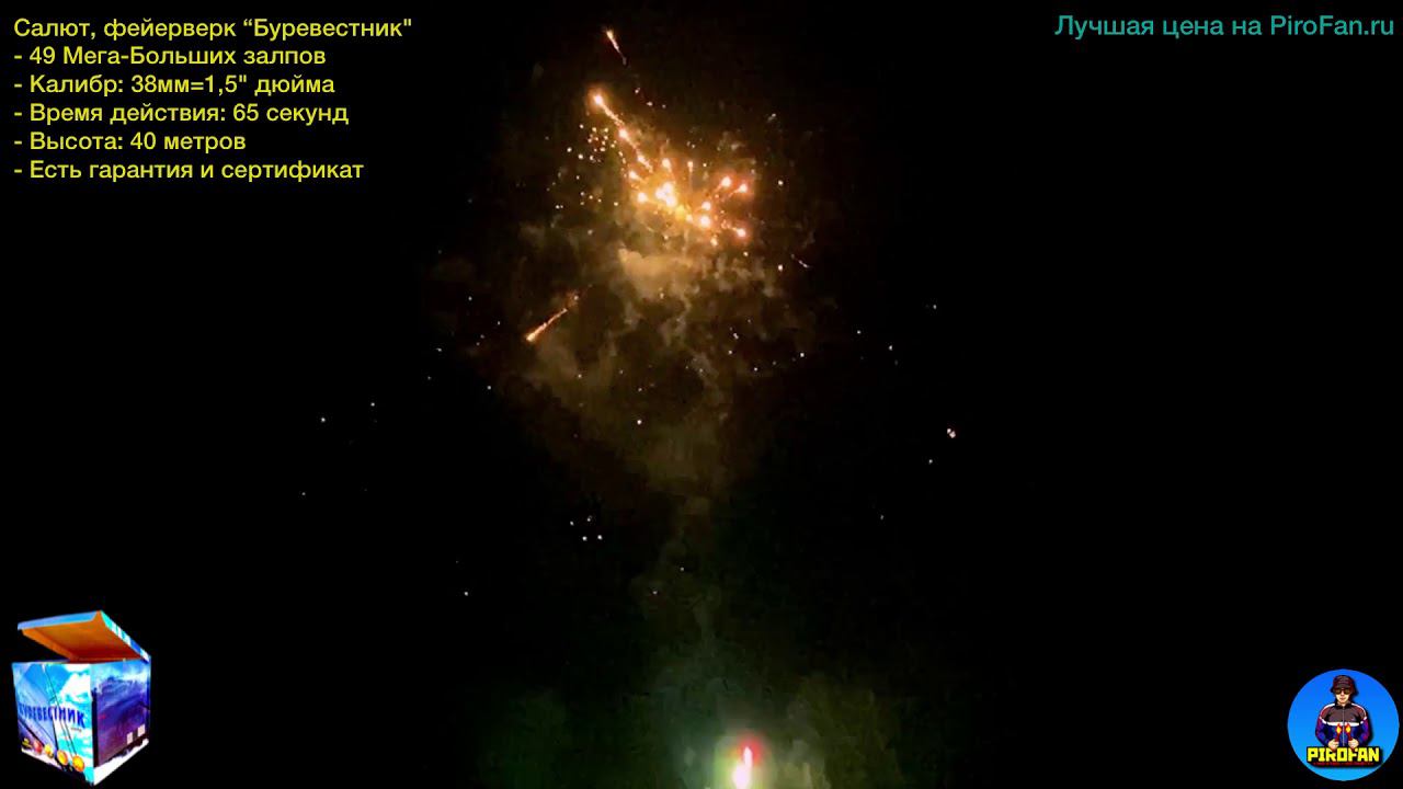 Салют, фейерверк 49 Мега-Больших залпов "Буревестник" Premium - Калибр: 38мм=1,5" дюйма - Время действия: 65 секунд - Высота выстрела: 40 метров - Есть гарантия и сертификат Магазин: https://www.PiroFan.ru Магазин VK: https://www.vk.com/PiroFan Instagram: https://www.Instagram.com/pirofan_ru Whats App: https://www.wa.me/79636131693 - Уточнить наличие/Заказать/Полная консультация профессионалов +7 963 613-16-93 - Наш адрес: Москва, Метро Новогиреево, Саянская 11 корпус 1 - Осуществляем доставку по всей России