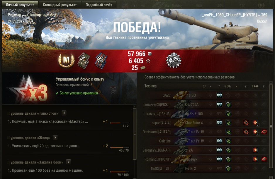 РЕДШИР МАСТЕР на Т69 ОПЫТ: 1423 СУММАРНЫЙ УРОН: 7831 медаль ДОЗОРНЫЙ