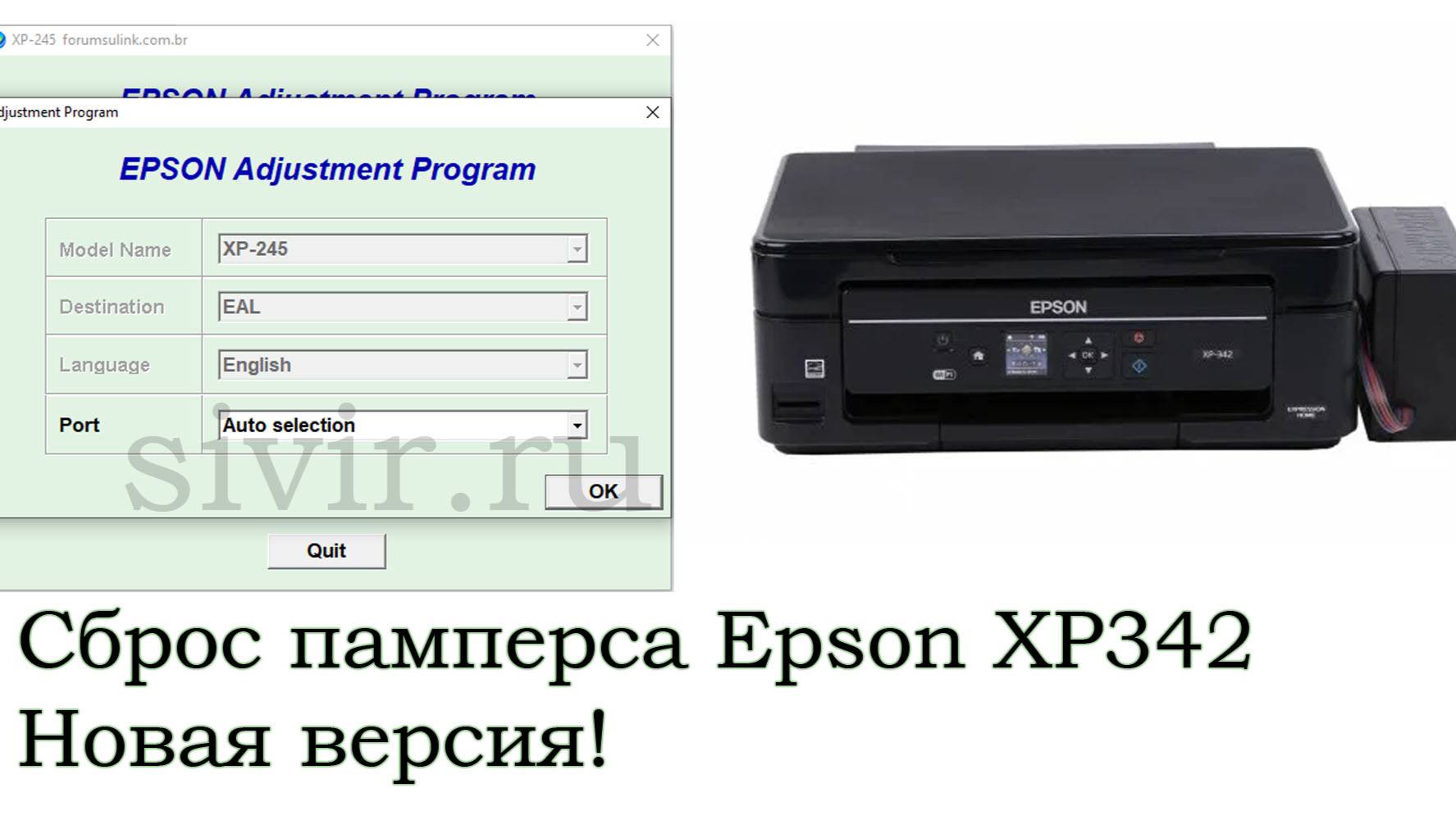 Новая версия программы Epson Adjustment Program XP-342 без отключения антивируса, смены даты и проблем с совместимостью Сброс под модели: Epson XP-245 Epson XP-247 Epson XP-342 Epson XP-343 Epson XP-345 Epson XP-442 Epson XP-445 поможем сбросить ошибку удаленно (вам нужно подключить принтер usb проводом и установить программу AnyDesk с сайта anydesk.com) Вы можете оформить заявку на удаленный сброс памперса здесь: https://sivir.ru/zakaz/