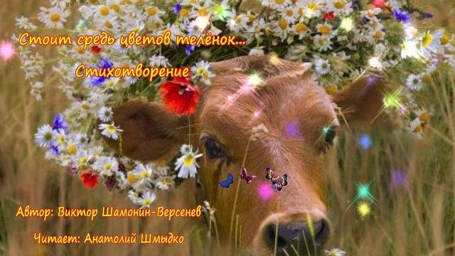 Стоит средь цветов телёнок...