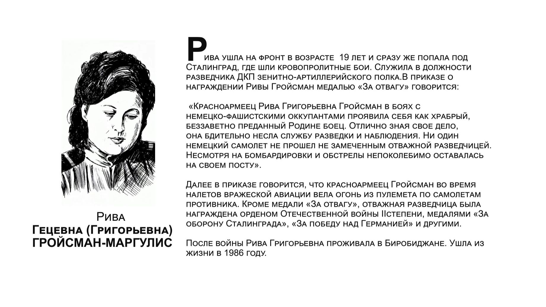 В годы Великой Отечественной войны на фронт ушли более 11 тысяч жителей ЕАО, семь тысяч наших земляков погибли или пропали без вести. Те, кто вернулись, прожили достойную жизнь. Они строили дома, выращивали хлеб, учили детей, стояли на охране правопорядка. Этим людям мы посвящаем нашу галерею "Бессмертный взвод". Среди героев - Рива Гецевна (Григорьевна) ГРОЙСМАН-МАРГУЛИС.
