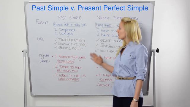 In today's Grammar Lesson let's learn about Past Simple v Present Perfect Simple: use and forms. Learn English with Julia! Subscribe to my channel today! Don’t forget to check out my website: https://www.yourenglishhub.com for more free English lessons (with quizzes, downloadable PDFs, and more) and connect through social media: https://www.facebook.com/learnenglishwithjulia/ https://plus.google.com/u/0/+LearnEnglishwithJulia https://www.pinterest.es/learnenglishwithjulia/ https://twitter.com/learnwithjulia Transcript of video: Hello and welcome back! Let's find out when to use the past simple and the present perfect simple. Now the forms first of all. If we have a regular verb, in order to create the past simple we take the bare infinitive (infinitive without "to") and add "-ED". For example: watch - watched There are obviously some spelling changes notably "complete" which has a silent -E which we removed before adding "-ED": "completed" we also have plenty of irregular verbs for example "to teach" which becomes I "taught" in the past simple So please review your irregular verbs and watch the video on the "-ED" endings and their spelling that is for the form of the past simple when do we use this tense? we use it when we focus on a finished action For example: I booked my flights yesterday When we focus on a certain time in the past I spoke to him an hour ago or when we are referring to a specific action or event I went to the US last summer that also answers the question: which signal words do I use with the past simple? yesterday..., an hour ago..., two weeks ago..., last summer..., last month..., last week... and so on Now that's one of the main differences between the past simple and the present perfect simple Well let's start off with the form. We create the present perfect simple using "have" or "has" so "to have" as an auxilary in the present simple + the past participle which we can create either by taking the bare infinitive and adding "-ED" or adding "-ED" with certain spelling changes or with an irregular form so let's start off with "complete": I have completed or with an irregular verb, "to teach" I have taught When do we use this tense? we use it when we focus on the result of an action in the past, the result in the present for instance: I have booked my flights Or we use it with "just", "already", or "not yet" I have just spoken to him we can also use this tense when we want to find out whether or not we have done something or how often we have done it until now I have been to the States several times before. so we can use it with other signal words such as "never" I have never seen this film up to now or lately So please get some practice so that it all makes sense and thanks for watching! Help us caption & translate this video! https://amara.org/v/dklB/