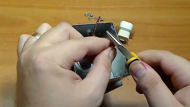 Итак, перед тем, как менять проходные конденсаторы, нужно еще раз убедиться, что они неисправны и подобрать донор. Донором является магнетрон, неисправный, либо разгерметизированный, либо с потерей эмиссии, но у него хорошие проходные конденсаторы. Так как в продаже конденсаторов нет, их не продают свободно, их приходится снимать с дохлых магнетронов и ставить на магнетрон, который мы восстанавливаем. Итак, чтобы проверить магнетрон, мы на приборе ставим прозвонку и меряем магнетрон относительно корпуса. То есть один контакт на любой из электродов катода, и второй контакт на корпус. И у нас получается короткое замыкание. Это говорит о том, что проходной конденсатор какой-то из двух на коротком замыкании, нам нужно его сейчас высверлить и также приготовить конденсатор с донора. Следующим шагом нам нужно вскрыть крышку фильтра. Вскрывать нужно как и у первого магнетрона, который мы восстанавливаем, так и у донора, с которого будем использовать проходные конденсаторы. Так, вот я отогнул три стороны, четвертую можно таким вот образом сделать – немножко разгибаем, и она ослабевает и снимается. Далее, мы берем бокорезы и приподнимаем вот так фильтр, берем бокорезы и откусываем наш неисправный блок проходных конденсаторов. Как видно, этот блок проходных конденсаторов заклепан, как бы развальцован, и это нужно все дело высверлить с помощью дрели, либо с помощью моей шлифовально- гравировальной машинки. Вот я снял крышку тоже у магнетрона-донора, с которого мы будем использовать проходные конденсаторы, и сразу обговорим один нюанс. Перед тем, как откусывать проходной конденсатор, тот который неисправен, он уже нам конечно не пригодится, поэтому откусываем как можно короче его. А вот у донора проходные конденсаторы откусить лучше, чтобы проводники от него были подлиннее. Потому что мы будем скручивать, поэтому нам нужен 1-1,5 см иметь в запасе. Вот так вот немножко раздербаниваем дроссель и уже откусываем с запасом. Далее, мы берем сверло, я взял сверло диаметром 3,14, ну 3- 3,5 прекрасно подойдет. Ну, на старом можно сразу поставить жирный крест, а тот, который будем ставить, надо выпрямить у него провода. И также нужно будет их зачистить от лака. Вот таким образом можно это сделать, либо наждачной бумагой крупной, крупнозернистой… Далее делаем то же самое с дросселями – отматываем по витку, а то и полтора, и выпрямляем. И, также как и в случае с проходными конденсаторами, нам нужно их зачистить. Ну вот, лак снят. Теперь нам нужно прикрутить проходные конденсаторы. Можно как и с этой стороны, можно и с внутренней стороны. Но у нас остались заусенцы от сверления, поэтому эти заусенцы нужно убрать. Можно конечно пройтись сверлом большего диаметра и также можно использовать надфиль и вот эти места немного подработать. Итак, ставим проходной конденсатор. Заранее нужно запастись болтами и гаечками на 3 мм. И закручиваем. И затягиваем потуже. Болтики можно использовать подлине, если нет коротких – ничего страшного. Так, теперь нам нужно спозиционировать как бы вместе. Таким вот образом, и сейчас будем делать скрутку. Для того, чтобы сделать надежную и крепкую скрутку, берем несколько плоскогубцев – одними зажимает, а вторыми начинаем вращать. Таким вот образом. Ну, здесь тоже важно не перестараться, потому что он натяжения медный провод может лопнуть. Так, в