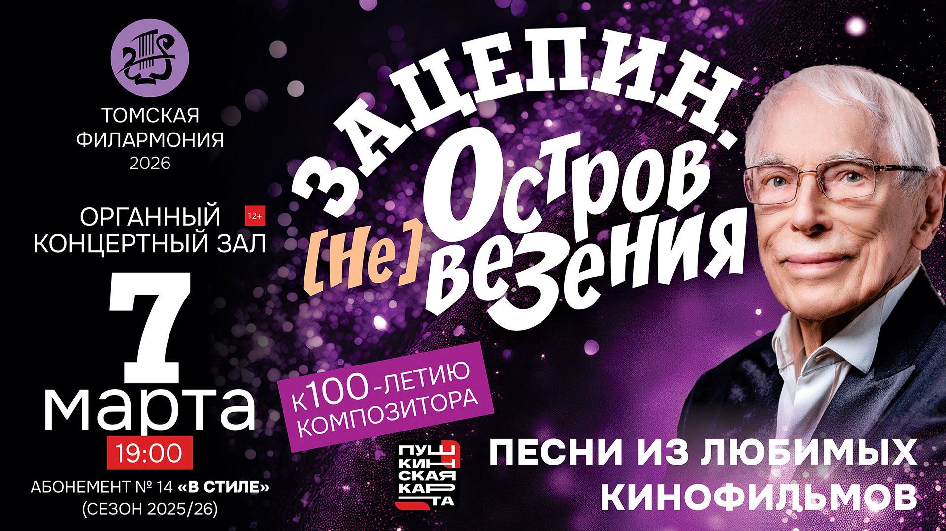 «Кавказская пленница», «Бриллиантовая рука», «Иван Васильевич меняет профессию», «Земля Санникова», «31 июня» – наши любимые фильмы невозможно представить без музыки и песен, написанных для них композитором Александром ЗАЦЕПИНЫМ – «ЖЕЛЕЗНЫМ ШУРИКОМ», как прозвали его друзья за трудолюбие, упорство и верность своему делу. 10 марта Александру ЗАЦЕПИНУ исполняется 100 лет! И это редчайший в мире случай жизненного и творческого долголетия!!! Мартовская встреча с любимым страной и киноманами всего мира композитором в рамках филармонического абонемента «В Стиле» напомнит слушателям о том, что: – к музыке его привела служба в рядах Советской армии. Талантливый юноша освоил несколько музыкальных инструментов и так виртуозно на них играл, что на него обратил внимание комвзвода – будущий знаменитый советский актёр и режиссёр Евгений Матвеев. Он и порекомендовал рядового Зацепина в Новосибирский армейский ансамбль песни и пляски. Сам Зацепин признавал, что если бы не армия, вряд ли он бы стал профессиональным музыкантом; – в его музыкальном восхождении были Новосибирск, Казахстан, Москва – и, наконец – встреча с легендарным Леонидом Гайдаем; – его жизнь составили годы упорнейшего труда и гениальных музыкальных озарений, открытие одной из первых в стране собственной профессиональной экспериментальной студии звукозаписи; – как признается сам композитор, одной из главных черт его натуры была и остается способность «плыть против течения» и чутко слышать своё ВРЕМЯ. Не упустим редчайший случай быть на композиторском юбилее; от имени музыкантов и слушателей поздравить Александра ЗАЦЕПИНА, пожелать МАЭСТРО здоровья, человеческой и творческой энергии – и – снова и снова – попасть в фантастический круг его музыкальных шедевров! Исполнители: Ирина МАКАРОВА (сопрано) Юлия ШИНКЕВИЧ (сопрано) Денис ДОРОФЕЕВ (тенор) Вячеслав КЛИМЕНКО (баритон) Павел ШИНКЕВИЧ (фортепиано) Ведущая – заслуженный работник культуры Российской Федерации, музыковед Вера ТИМОФЕЕВА В программе: Песни из любимых кинофильмов на музыку Александра Зацепина ст. Л. Дербенёва. «Остров невезения» («Бриллиантовая рука») ст. Л. Дербенёва. «Песня про зайцев» («Бриллиантовая рука») ст. Я. Зискинда. «Надо мной небо синее» («Наш милый доктор») ст. Л. Дербенева. «Танго» («12 стульев») ст. Л. Дербенёва. «Купидон» («Не может быть») ст. Л. Дербенева. «Ищу тебя» («31 июня») ст. Л. Дербенева. «Этот мир придуман не нами» ст. Л. Дербенева. «Песня о медведях» («Кавказская пленница») ст. О. Гаджикасимова. «Первая весна» («Белый рояль») ст. Л. Дербенева. «Куда уходит детство» («Фантазии Веснухина») ст. Л. Дербенева. «Есть только миг» («Земля Санникова») ст. Л. Дербенева. «Разговор со счастьем» («Иван Васильевич…») ст. Л. Дербенев. «Небо моё» («Между небом и землей») ст. О. Гаджикасимова. «Я буду ждать тебя» («Белый рояль») ст. Л. Дербенева. «Всё равно ты будешь мой» («Ангел в тюбетейке») ст. Л. Дербенева. «Помоги мне» («Бриллиантовая рука») ст. О. Гаджикасимова. «Горная дорога» («Белый рояль») ст. Н. Дербенева. «Звенит январская вьюга» К 100-летию композитора