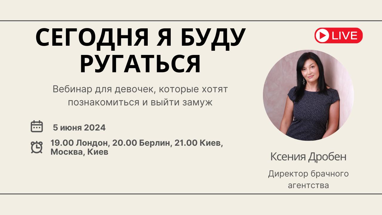 Сегодня мы встречаемся с вами на вебинаре, и я буду ругаться. Вебинар состоится в среду, 5 июня Время: 19.00 по Лондону, 20.00 по Берлину, 21.00 по Киеву, Минску и Москве Вебинар пройдет на платформах: на канале YouTube Ksenia Droben https://www.youtube.com/@KseniaDrobenPartnervermittlung На странице Facebook https://www.facebook.com/ksenia.droben В группе Facebook https://www.facebook.com/groups/datingmarriageagency VK https://vk.com/kseniadroben Instagram @kseniadroben Tiktok: @kseniadrobendating Наши ближайшие мероприятия: 15 июня, суббота – онлайн вечеринка знакомств в zoom -https://bridespb.com/ru/vstrecha-znakomstv-online/ 22 июня, суббота – вечеринка знакомств в Мюнхене – https://droben-partnervermittlung.de/ru/vecherinka-dating-munchen/ 20 июля, суббота – вечеринка знакомств в Кельне - https://droben-partnervermittlung.de/ru/single-dating-party-germany-2/ **** Если получение наших рассылок больше не актуально для Вас, напишите нам, пожалуйста, на мейл info@droben-partnervermittlung.de и мы удалим Ваш мейл из новостной рассылки С уважением Международное брачное агентство Ксении Дробен “VIP-International“ www.bridespb.com www.droben-partnervermittlung.de/ru Whatsapp +4915203663653