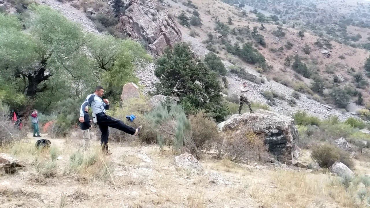 Учу сложнокоординационным движениям туристов из нашей группы в походе по Фанским горам на высоте 3200м. Я стою справа на высоком камне, с которого можно легко упасть :)