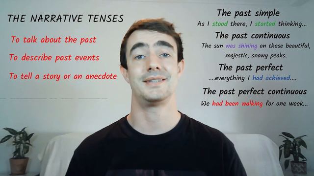Narrative tenses- I am going to tell a short anecdote about my time in the Himalayan mountains. Narrative tenses are used to talk about the past, to describe past events and to tell stories or an anecdote. They are very important at intermediate and advanced levels. Narrative tenses are comprised of: The past simple- used to describe a series of events- Subject + past form of the verb. The past continuous- used to set the scene or show an action in progress in the past- Subject + was/were + verb-ing. The past perfect- used to talk about a completed action before the main past event- Subject + had+ the past participle. The past perfect continuous- Used to talk about action in progress before the main past event- Subject + had+ been + verb-ing _________________________________________________ Check out some other travel videos: Travel phrasal verbs- https://www.youtube.com/watch?v=ZYlrQQ8dUto&t=3s Travel idioms- https://www.youtube.com/watch?v=E3memncASnU&t=268s ___________________________________________________ Social media: Follow me on Instagram: https://www.instagram.com/dream.of.english/ Check out my channel: https://www.youtube.com/channel/UCPXJmqDd2592jObTcozWtaA?view_as=subscriber Facebook: https://www.facebook.com/Dream-of-English-103709128082691