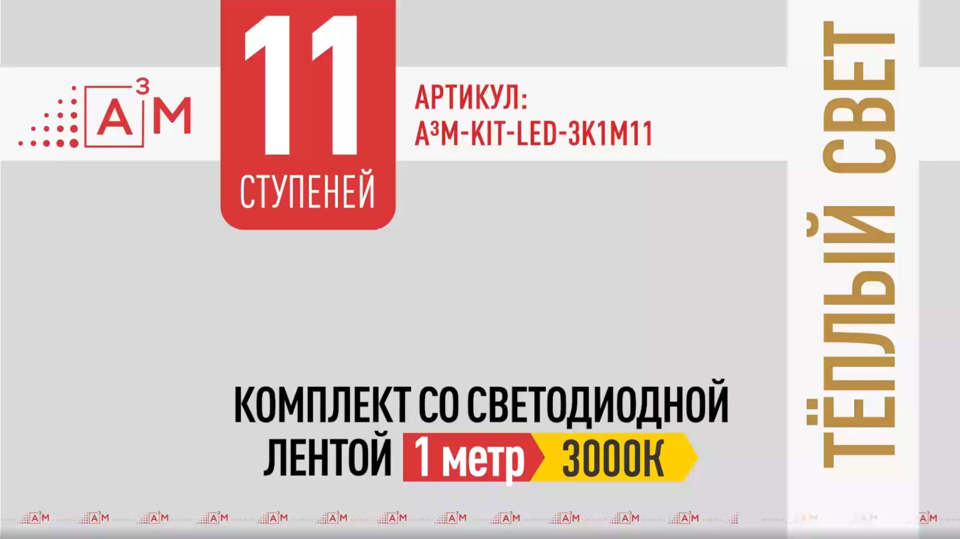 Комплект подсветки лестницы A³M — это готовое решение для автоматического освещения ступеней в доме. Данный комплект рассчитан на 11 ступеней и включает все необходимые компоненты для быстрой установки и стабильной работы системы. В состав комплекта подсветки лестницы A³M входит светодиодная лента, нарезанная на 11 отрезков по 1 метру. Это обеспечивает равномерную подсветку ступеней по всей ширине без темных зон. Теплый свет 3000K создает комфортное и мягкое освещение, идеально подходящее для жилых помещений. Комплект подсветки лестницы A³M работает автоматически за счет датчиков движения. При появлении человека подсветка плавно включается по направлению движения — снизу вверх или сверху вниз. Это делает передвижение безопасным и добавляет эффект современной умной лестницы. 🔧 В комплект входит: • Светодиодная лента — 11×1 м (3000K, теплый свет) • Контроллер A³M для управления подсветкой • Датчики движения • Блок питания • Кабель для датчиков движения - витая пара 20м. Комплект подсветки лестницы A³M подходит для установки в частных домах, коттеджах и квартирах. Все элементы системы полностью совместимы и рассчитаны на длительную и стабильную работу. Если вы ищете надежный комплект подсветки лестницы A³M, который легко установить и который будет работать автоматически — это оптимальное решение. Больше комплектов, на нашем сайте: https://a3m.ru
