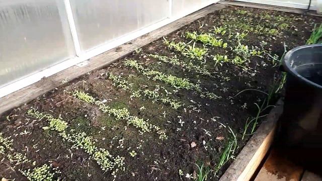 Редис, салаты, зелёный лучок подрастают в моей теплице. На даче ещё много снега.
