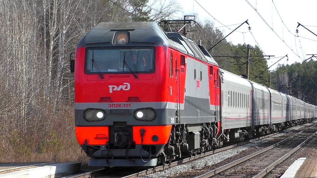 Электровоз ЭП2К-101 со скорым поездом №185Е Тюмень — Симферополь следует по перегону Исток - Путевка через о.п. Чапаевская. Свердловская ЖД. Свердловская область, Россия. Приписка: ТЧЭ-3 Барабинск. 06.04.2025