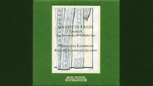 Provided to YouTube by Kontor New Media GmbH Chorbuch 14 · Mauricio Kagel · Nederlands Kamerkoor Chorbuch/Les Inventions d'Adolphe Sax ℗ Winter & Winter GmbH Released on: 2012-04-20 Artist, Conductor: Mauricio Kagel Choir: Nederlands Kamerkoor Composer: Mauricio Kagel Lyricist: Traditional Music Publisher: C. F. Peters, Frankfurt Leipzig London New York Auto-generated by YouTube.