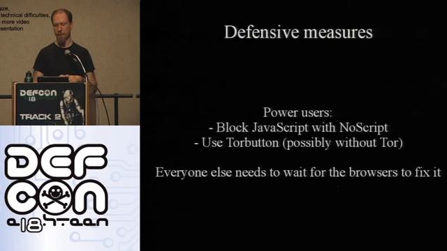 Speaker: Peter Eckersley This talk reports the results of the panopticlick browser fingerprinting experiment. We show how inoccent-looking version and configuration information can be used to uniquely identify almost all desktop browsers, without use of cookies or IP addresses. We discuss how this comes about, how serious a problem it is, and just how hard it will be to fix... For presentations, whitepapers or audio version of the Defcon 18 presentations visit: http://defcon.org/html/links/dc-archives/dc-18-archive.html