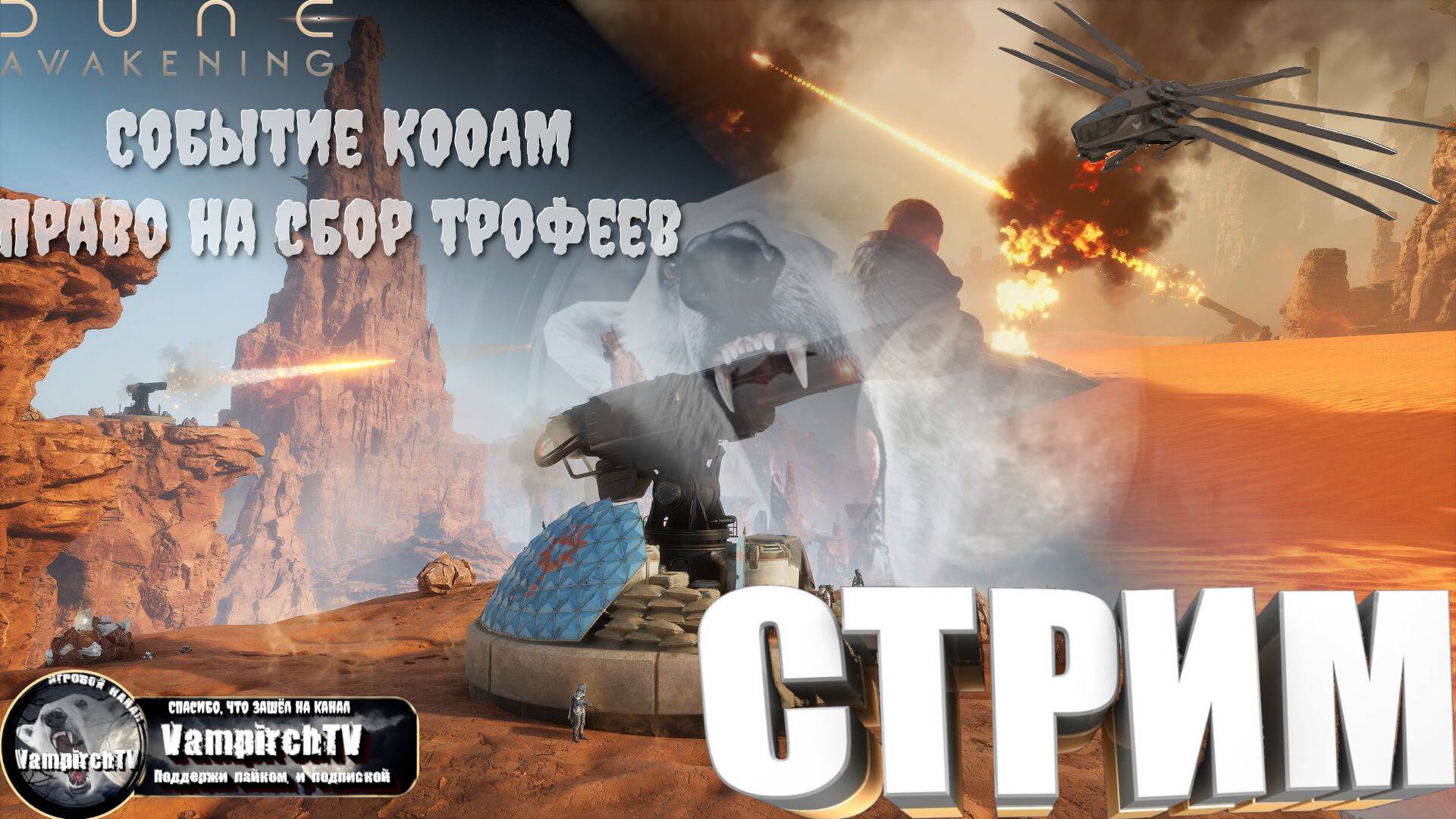 ⭐️Спасибо, что зашёл на канал. Поддержи лайком, и подпиской, для тебя это не трудно, а для меня это лучший подарок!!!! 🎁 ВАША ПОМОЩЬ В РАЗВИТИИ КАНАЛА⭐️ https://www.donationalerts.com/r/vampirchtv 🎁 boosty⭐️ https://boosty.to/vampirchtv ⭐️В небе над котловиной Хагга растет активность КООАМ. Грузовой корабль — завидная добыча, и кирабы это понимают. Их артиллерия гремит по всей пустыне, отправляя корабли навстречу песчаным дюнам. ⭐️Над обломками поднимается дым, а КООАМ активно ищет наемников, чтобы защитить свою собственность от кирабов. ⭐️Спящие, вы готовы прийти на помощь? ⭐️Приветствуем вас, Спящие! ⭐️Событие «КООАМ: право на сбор трофеев» уже началось! Грузовые корабли КООАМ падают с небес по всей котловине Хагга. Их груз может оказаться у вас в руках, но только если переживете встречу с бандитами и, конечно же, песчаными червями. ⭐️СТРИМЫ КАЖДЫЙ ДЕНЬ В 20: 00 ПО МСК.⭐️ ✅VK Play Live⭐️ live.vkplay.ru/vampirchtv ✅YouTube⭐️ https://www.youtube.com/@vampirchTV ✅Rutube⭐️ rutube.ru/channel/27642037 ✅Trovo⭐️ https://trovo.live/s/VampirchTV ⭐️А еще! Расскажите своим друзьям об игре :⭐️Dune Awakening⭐️ и играйте вместе с нами!!! Приобрести игру можно по ссылки ниже: https://store.steampowered.com/app/1172710/Dune_Awakening/ Правила чата и комментариев: ⭐️Адекватность и уважение. Самое главное - это относиться друг к другу с элементарным уважением и вести себя адекватно в любой ситуации. ⭐️Политика и религия. Две крайне острые темы, которые мы не затрагиваем не в серьёзном ключе, не в шуточном канал и всё вокруг него посвящено творчеству и создано ради получения удовольствия и отдыха. ⭐️18+. Все мы люди взрослые и потому иной раз можем обсуждать и шутить на разные темы, в том числе не исключён чёрный юмор или пошлятина. Всё это допустимо в рамках нашего чатика, если оно не нарушает первых двух правил. Так же: ✅STEAM⭐️ https://steamcommunity.com/profiles/76561198036037187 ✅Vk Группа⭐️ https://vk.com/club4723323 ✅Дискорд⭐️ https://discord.com/channels/936291870634573854/965873761100378112
