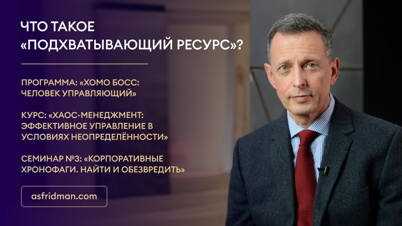 Что такое «подхватывающий ресурс»? Программа: «Хомо Босс: Человек Управляющий» Курс: «Хаос-Менеджмент: Эффективное управление в условиях неопределённости» Семинар №3: «Корпоративные хронофаги. Найти и обезвредить» Расписание открытых семинаров Александра Фридмана: https://www.asfridman.com/raspisanie/