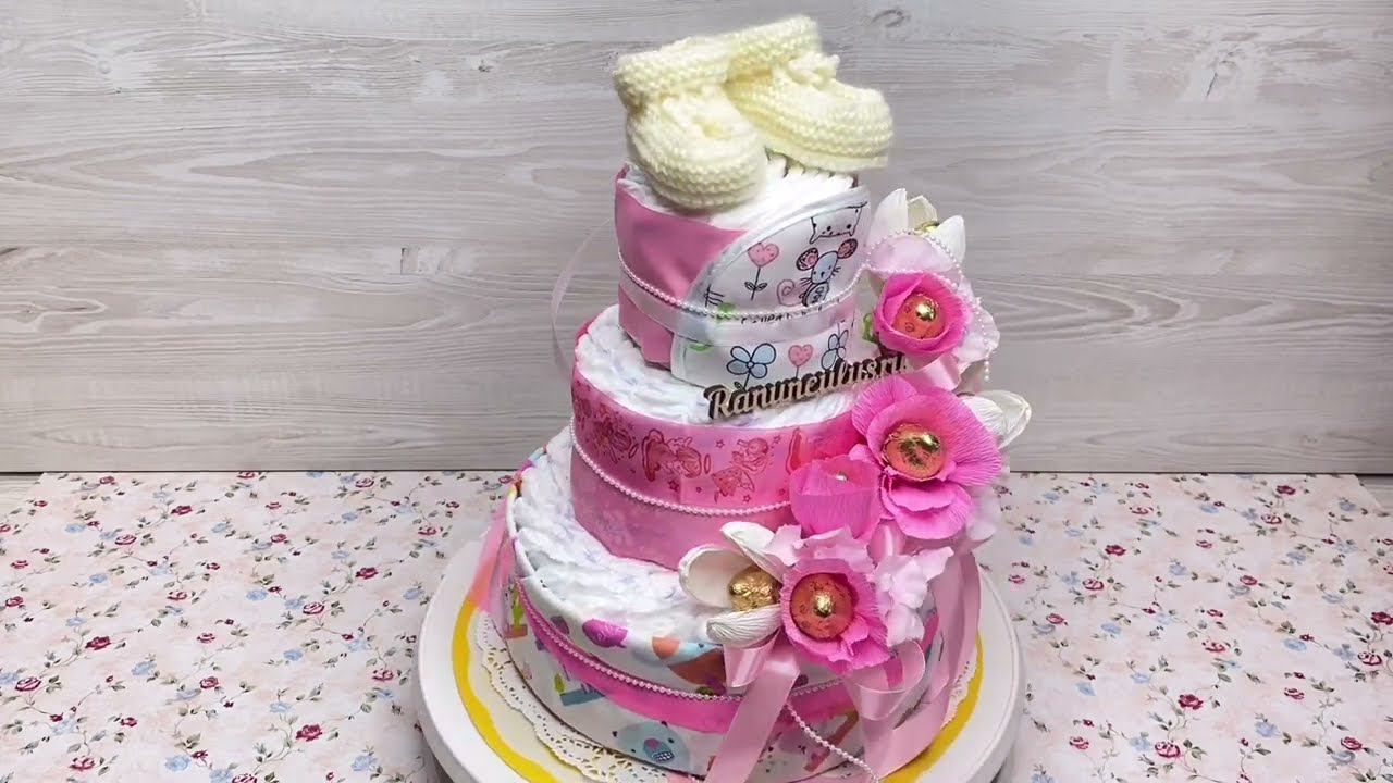 Торт из памперсов с вязаными пинетками