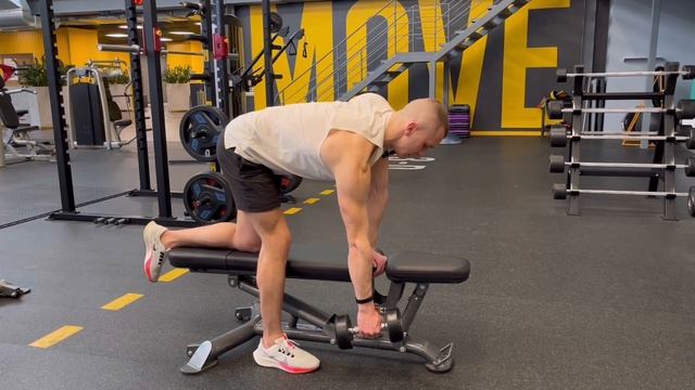 https://play.google.com/store/apps/details?id=com.nla.personalfitnesstrainer Техника выполнения: ⁃ 3 точки опоры (нога, колено, рука); ⁃ Сохраняем естественный прогиб в пояснице; ⁃ Приводим лопатку рабочей руки; ⁃ Отводим вдоль тела плечо назад; ⁃ На выдохе отводим плечо назад, на вдохе возвращаем в исходное положение. Задействованные мышцы: ⁃ Широчайшая мышца спины. Ошибки при выполнении: ⁃ Сутулая спина; ⁃ Размашистое движение; ⁃ Подъём гантели за счёт сгибания локтя.