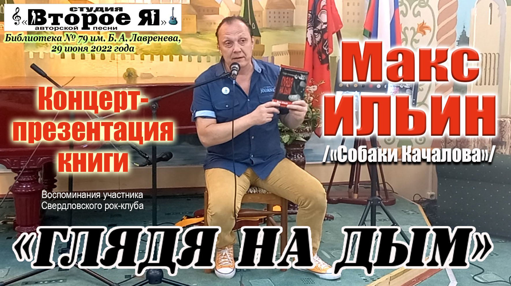 Концерт-презентация книги "Глядя на дым" лидера группы "Собаки Качалова" Макса Ильина. Библиотека № 79 имени Б. А. Лавренева, 29 июня 2022 года. Продолжительность - 1 час 07 минут.
