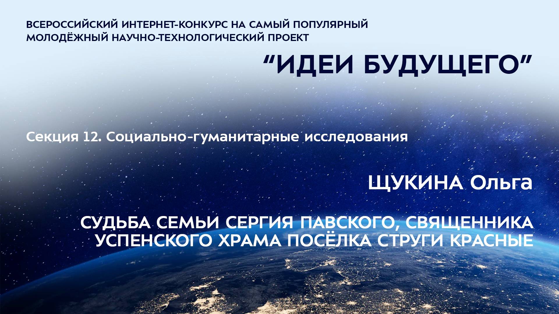 (12-3) ЩУКИНА Ольга Глебовна Псковская область, рп Струги Красные МБОУ «Струго-Красненская СОШ», 9 класс СУДЬБА СЕМЬИ СЕРГИЯ ПАВСКОГО, СВЯЩЕННИКА УСПЕНСКОГО ХРАМА ПОСЁЛКА СТРУГИ КРАСНЫЕ Научные руководители: Матвеев Николай Викторович, Псковская область, рп Струги Красные, МБОУДО «Дом детского творчества», педагог дополнительного образования, руководитель проекта «София», Соколов Алексей Алексеевич, Псковская область, рп Струги Красные, МБОУДО «Дом детского творчества», координатор проекта «София» Более подробно о мероприятиях Программы "Шаг в будущее" можно узнать на сайтах http://www.step-into-the-future.ru/ и http://шагвбудущее.рф Мероприятия проводятся при поддержке Фонда президентских грантов