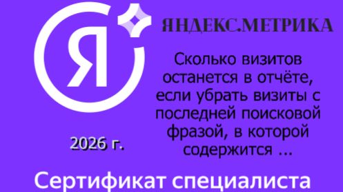 Сертификация специалистов по Яндекс.Метрика.2026 Тест: Сколько визитов останется в отчёте, если убрать визиты с последней поисковой фразой, в которой содержится ...