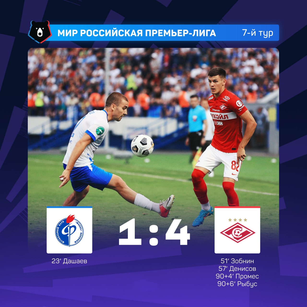В матче 7 тура встречались Факел и московский Спартак. Первый тайм у Спартака ничего не получалось. А Факел даже смог забить гол. И контролировал матч. Во втором тайме факел подсел, а Спартак начал создавать моменты и смог отличиться четырежды