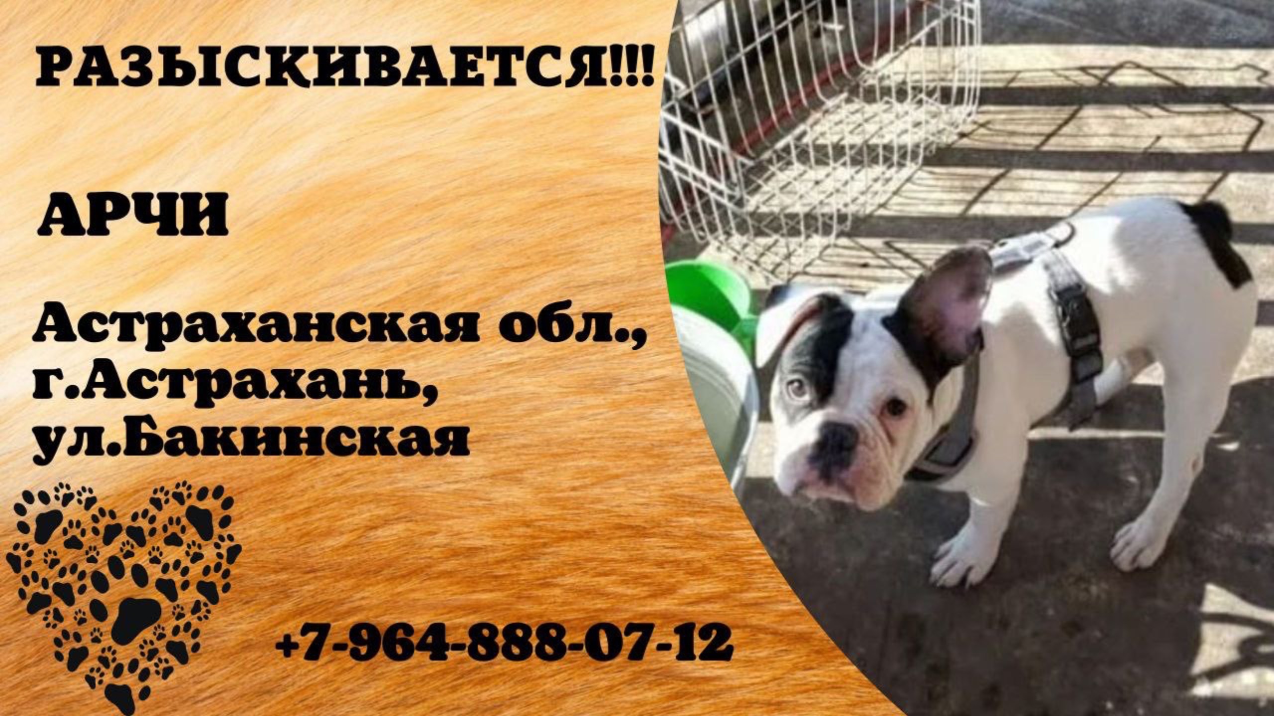 Астраханская Астрахань Пропала собака 17.07 Арчи, Окрас белый с чëрными пятнами, возле хвоста есть рисунок сердечка, убежал из дома в сторону адмирал Нахимова Имя хозяина: Виктория Телефон: 79648880712 Адрес: Бакинская улица, 23, Астрахань Инфо: https://vk.com/wall-198815410_203325 #пропала_собака#астраханская#астрахань