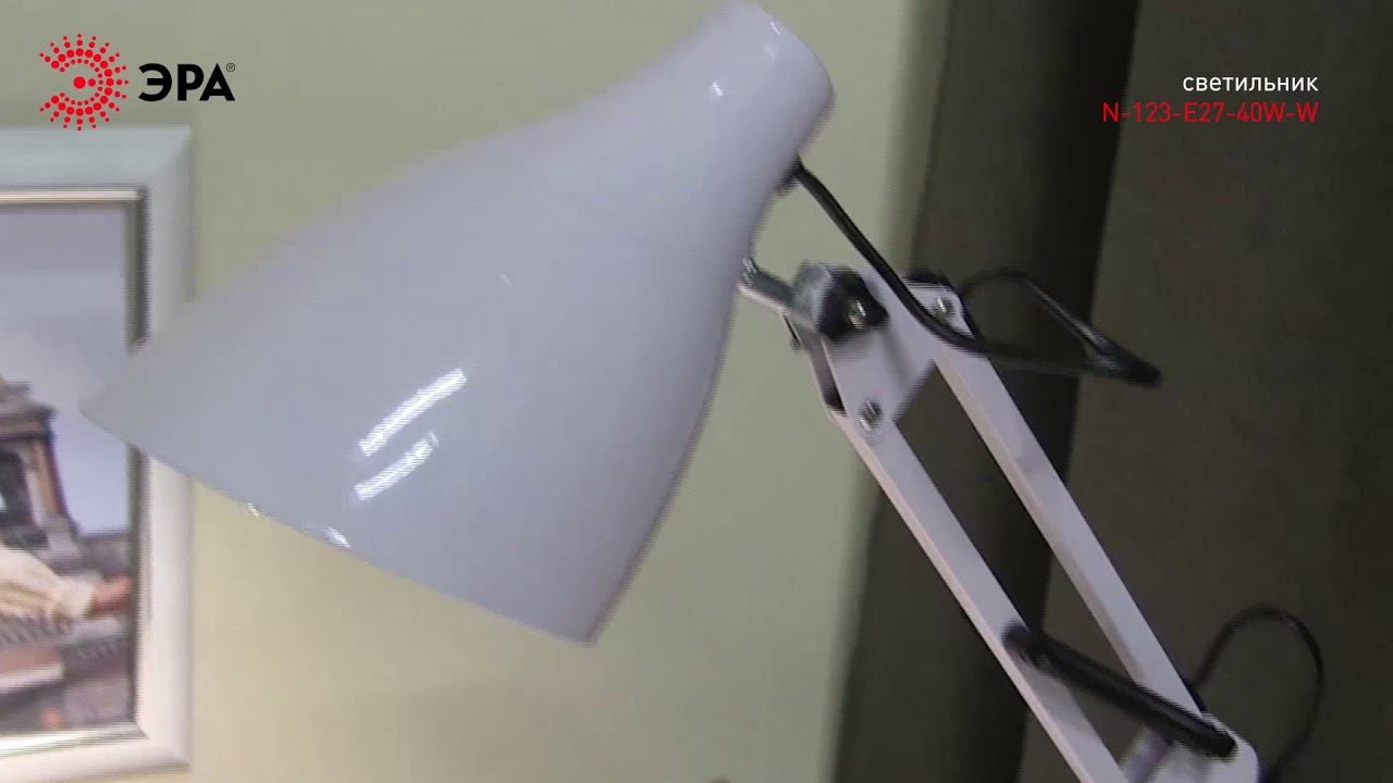 Светильник может использоваться с лампой накаливания, компактной люминесцентной лампой (КЛЛ) или светодиодной (LED) лампой. Металлические стойка и плафон. Устойчивая конструкция. Высота плафона регулируется двухсекционной сгибающейся стойкой. Удобная регулировка направления света. Трендовый дизайн и цвет. На сайте ЭРА: https://www.eraworld.ru/catalog/2652545 Официальный сайт ЭРА: http://www.eraworld.ru/ ЭРА в соцсетях: https://www.instagram.com/era_russia https://vk.com/era.russia https://www.facebook.com/ERA.russia/ https://m.ok.ru/era.russia/