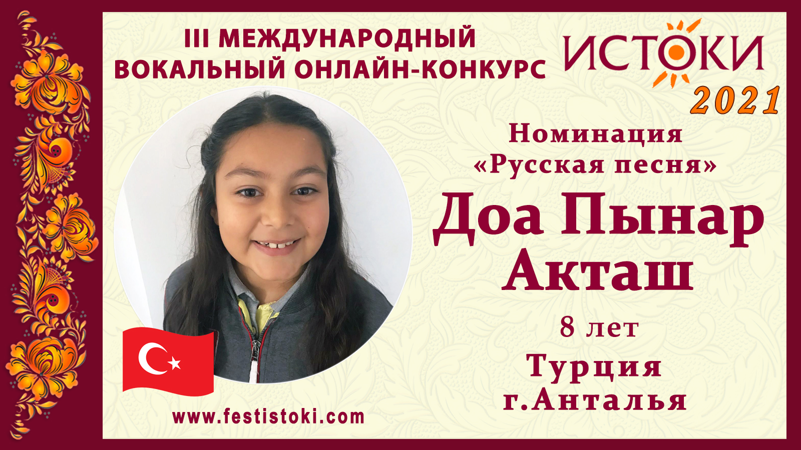 Участница III Международного вокального онлайн-конкурса «Истоки». Номинация "Русская песня". Песня "Колыбельная медведицы". Авторы Е. Крылатов, Ю. Яковлев. Сайт: www.festistoki.ru / www.festistoki.com E-mail: festistoki@mail.ru