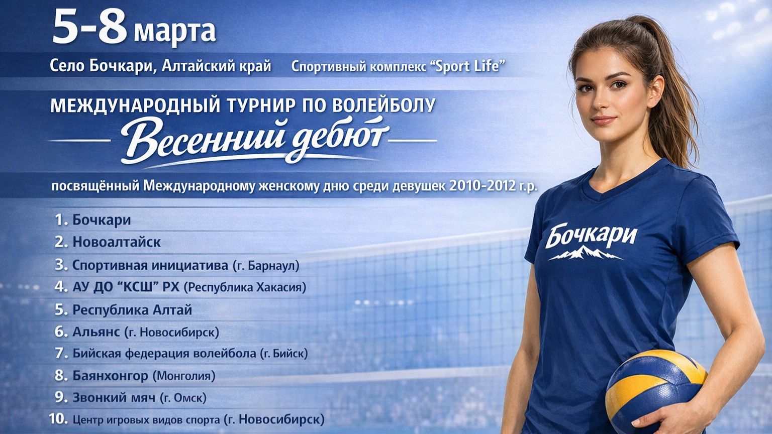 Международный турнир по волейболу "Весенний дебют"среди девушек 2010-2012 г.р. Спортивный комплекс "Sport Life", село Бочкари, Алтайский край.