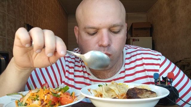 ОБЖОР макароны "бабочки" и остатки шашлыка/мукбанг салат овощной
