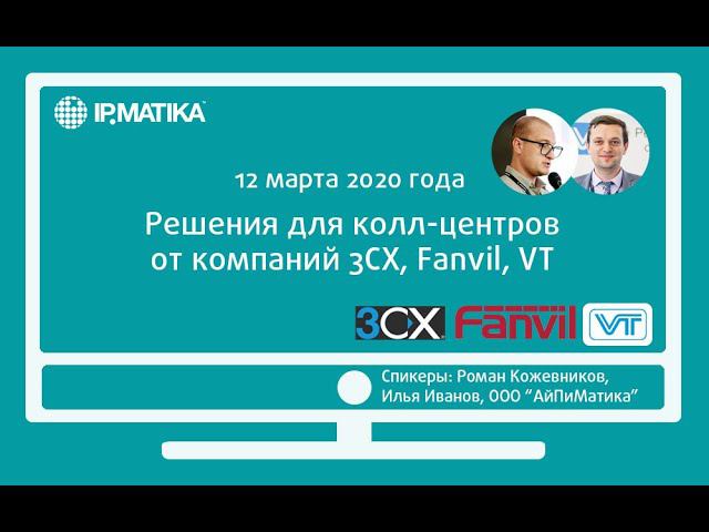 12 марта 2020 года с 12:00 до 13:00 (МСК) продакт-менеджер по специализированному VoIP-оборудованию Илья Иванов и продакт-менеджер по оборудованию для DECT-телефонии/специализированной телефонии Роман Кожевников провели вебинар "3CX, Fanvil и VT - решения для колл-центров". Спикеры рассказали партнерам о: - решениях для колл-центров от компании 3CX; - решениях для колл-центров от компании Fanvil; - решениях для колл-центров от компании VT.