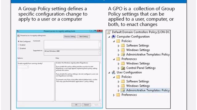Модуль №10 -- Сервисы доступа к файлам и печати 00:01:10 Права NTFS и DACL/SACL. Общие папки. Наследование прав в NTFS. Механизм Access-based Enumeration. 00:25:10 Механизм Offline Files. 00:28:10 Как работают Shadow Copies. 00:33:50 Сервис VSS. 00:57:07 Печать по сети. Enhanced Point and Print. Безопасность сетевой печати. 01:13:24 Механизм Branch Office Direct Printing. Централизованное управление принтерами. 01:19:35 Модуль №11 -- Group Policy в Windows Server 2012 01:25:45 Из чего состоит Group Policy (GPT/GPO/GPC). Локальные групповые политики. Хранение групповых политик в домене. Дополнительный механизм -- Group Policy Preferences. 01:53:35 Что такое Starter GPSs. Делегирование управления групповыми политиками. Работа групповых политик. 02:45:40 GPO Links и механизм применения политик к пользователям/узлам. GPO Security Filtering. Работа Group Policy Central Store. Хранение шаблонов (administrative templates). Производитель: УЦ Advanced Training Сайт производителя: http://www.atraining.ru/ Автор: Руслан Карманов Описание: Курс Microsoft 20410C - Installing and Configuring Windows Server 2012 R2 - предназначен для всех, кому нужно работать с Windows Server 2012 R2 и является базовым для всех остальных курсов по Windows Server 2012. Программа курса доработана учебным центром в сторону увеличения глубины материала и является более эффективной для получения знаний и сдачи экзаменов, чем упрощённый стандартный сертифицированный курс MS-20410.
