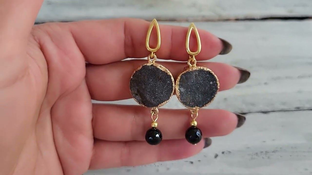 Серьги украшения из натуральных камней. Серги из кварца (друза), агата черного: кварц друза круг 20 мм., агат черный шарик 8 мм. ювелирная огранка, длина до швензы 40 мм., вес пары 14 гр. купить украшения можно в нашем магазине https://www.livemaster.ru/samotsvety-ot-granat-mk?view=profile