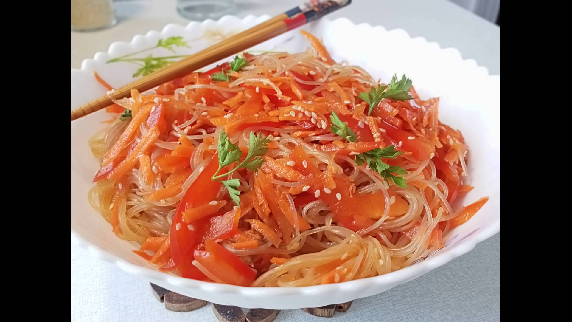 НЕ забудьте подписаться. Смотрите. Готовьте и наслаждайтесь. Это просто приготовить. Как вкусно приготовить фунчозу. Понадобится на 3-4 порции: Фунчоза 100 г. Морковь 1 шт. около 200 г Перец болгарский 1 шт. 200 г Соевый соус 4 ст. л. Уксус рисовый 1 ст. л. Масло растительное 3 ст. л. Чеснок 1 зубок Перец чили щепотка Кунжут 1 ст. л. Готовьте и наслаждайтесь.