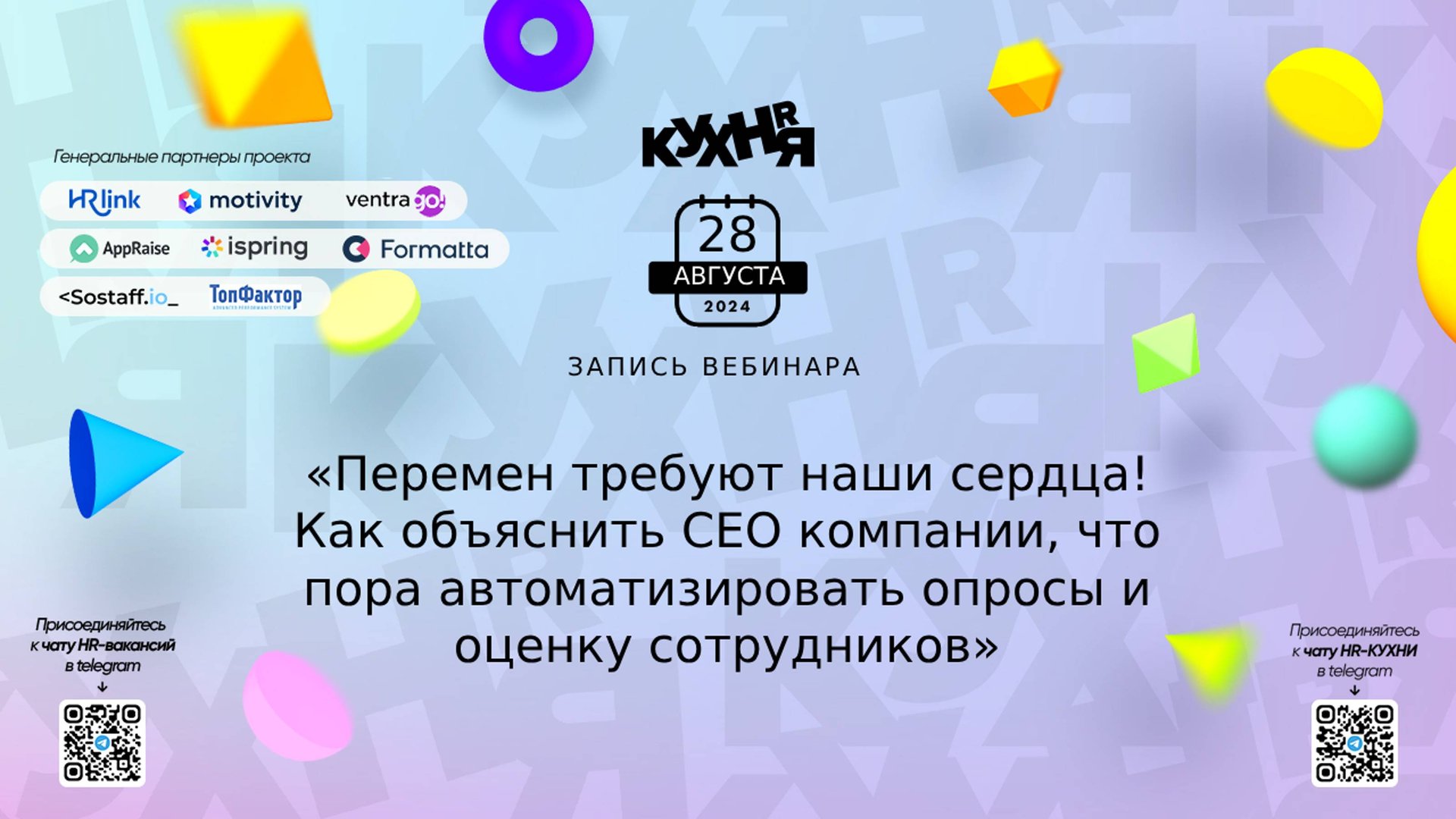 AppRaise — это HR-платформа для проведения опросов, оценки сотрудников и формирования культуры обратной связи c наглядными отчетами и аналитикой. Подробнее: https://clck.ru/3CNzJW Присоединяйтесь к чатам и каналам HR-КУХНИ в телеграм: - Основной чат HR-КУХНИ в телеграм - https://t.me/+tYgAH0PgPQVkOWIy - Канал HR вакансий в телеграм - https://t.me/+CMNAN2u1hjo3M2Ri - Канал HR-EVENTS в телеграм - https://t.me/hr_kitchen - Канал HR JOURNAL в телеграм - https://t.me/hrkitchenjournal Полезные ссылки: - Каталог HR решений - https://hrkitchen.ru/exhibition - График конференций, бесплатных вебинаров, а также бесплатные курсы – https://hrkitchen.ru/ - Стать спикером HR-КУХНИ - https://hrkitchen.ru/speakers - Подписаться на полезную e-mail рассылку от HR-КУХНИ (новости, гайды, чек-листы, подарки от партнеров) - https://hrkitchen.ru/subscribe