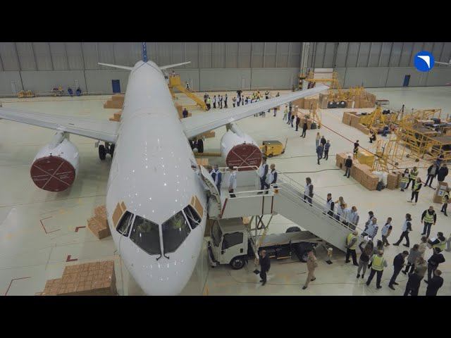 Подготовка к наземному испытанию эвакуации 219 человек из МС-21. Видео: Яковлев