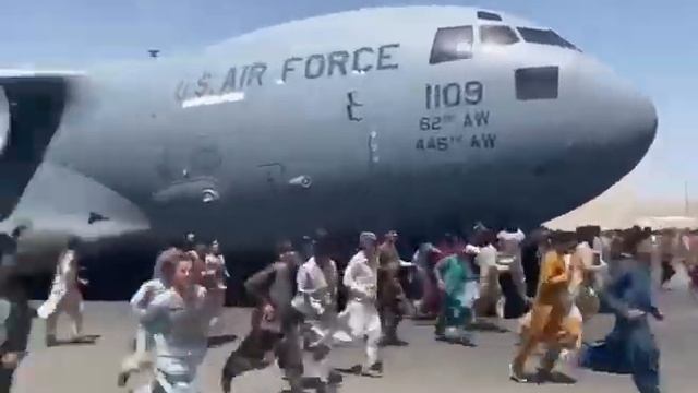 Сбежать из Афганистана любой ценой. На этих кадрах видно, что десятки людей действительно пытаются спастись из Афганистана, цепляясь за шасси и фюзеляж американских военных самолётов, вылетающих из страны. #Афганистан #самолёт #Америка