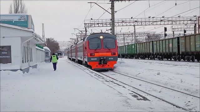 Электропоезд ЭД4М-0174 с пригородным поездом №6206/№7334 Челябинск Главный - Курган прибывает на 1-й путь Ст. Курган, Курганская обл., ЮУЖД Дата: 21.01.2024