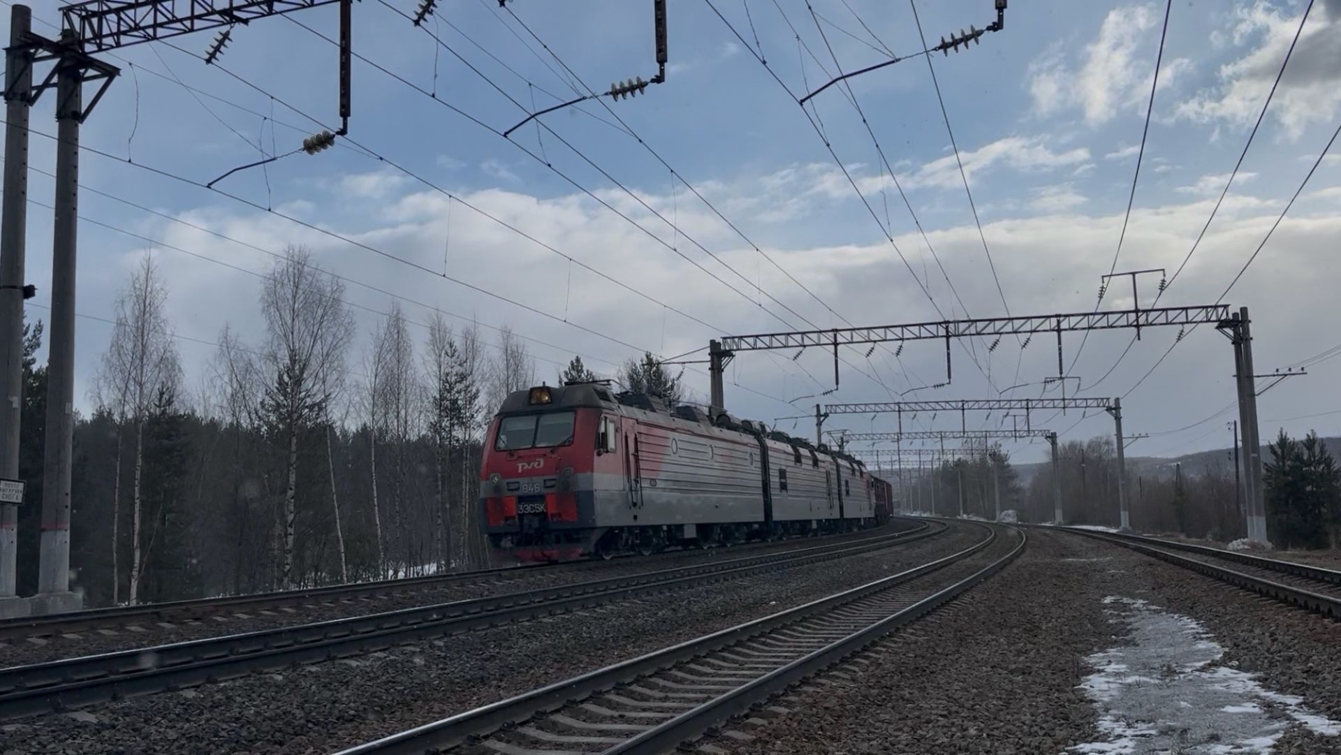 «Приветливый в снегопад!» Электровоз «Ермак» 3ЭС5К-846 с грузовым поездом на перегоне, 2025 год