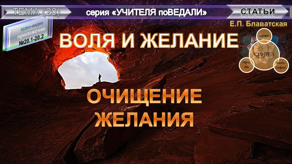 20-й аудио-видио том, из серии "Учителя поВедали", в которую входят аудио-видио тома, составленные и (или) скомпонованные Небесной Нитью на разные заданные темы из Записей воплощенных Учителей Земли. В данную заданную тему вошли две статьи Е.П. Блаватской: "Воля и желание" и "Очищение желания". "Синтез науки, религии и философии" - так обозначила суть своих трудов сама Елена Петровна Блаватская (1831-1891 г.г.) - великая наша соотечественница (урожденная Ган в г. Екатеринослав Российской империи, позднее переименованный г. Днепропетровск УССР, ныне в г. Днепр Украина), - стоявшая у истоков экстраординарного мировоззрения, основательница Теософского Общества (1875 Нью-Йорк).