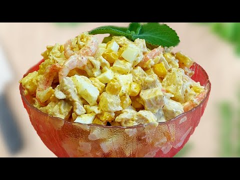 Неожиданно очень вкусный салат, все гости смели его за секунды, и еще искали добавку. ⠀ ? куриная грудка 350 гр ? чеснок 1 зубок крупный ? консервированный ананас 150-200 гр ? креветки 50-70 гр ? яйца 4 шт ? кукуруза 4 ст.л ? соль перец по вкусу ? майонез или сметана для заправки Приятного Аппетита !!!